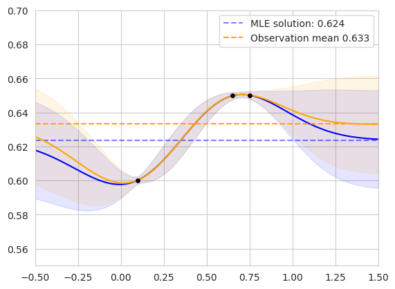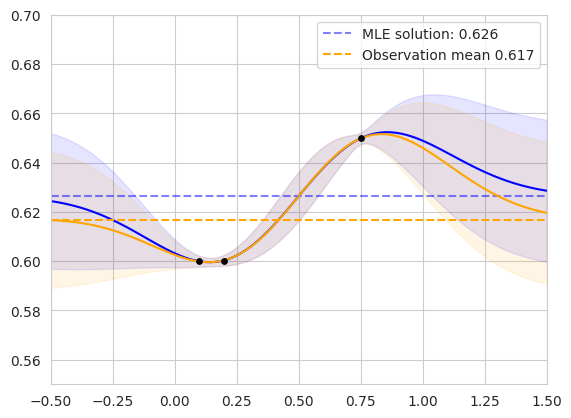 Now let’s compare a GP where $c$ is equal to the MLE vs. one with $c$ equal to the observation mean: